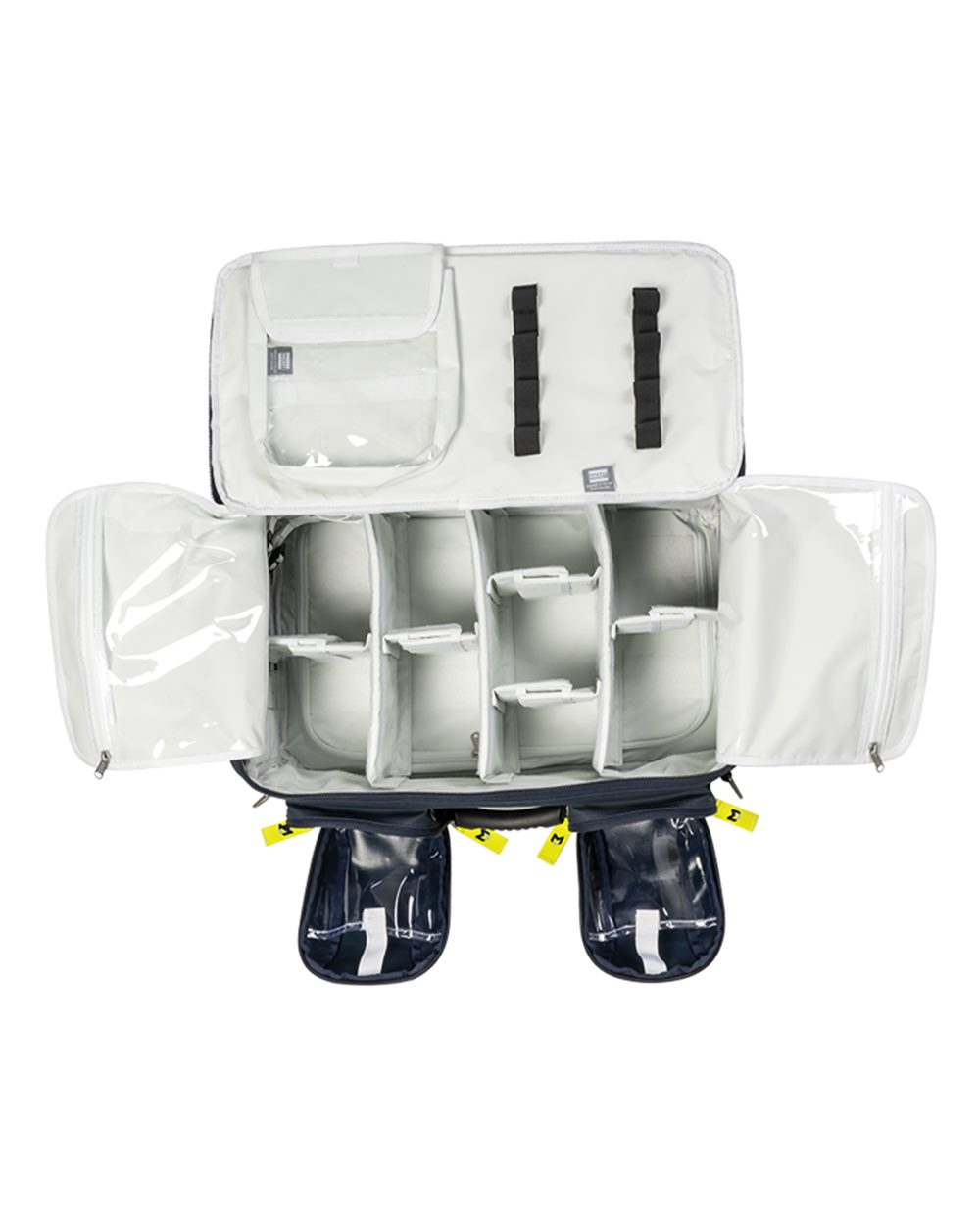 - Zippered internal compartments with clear view pockets