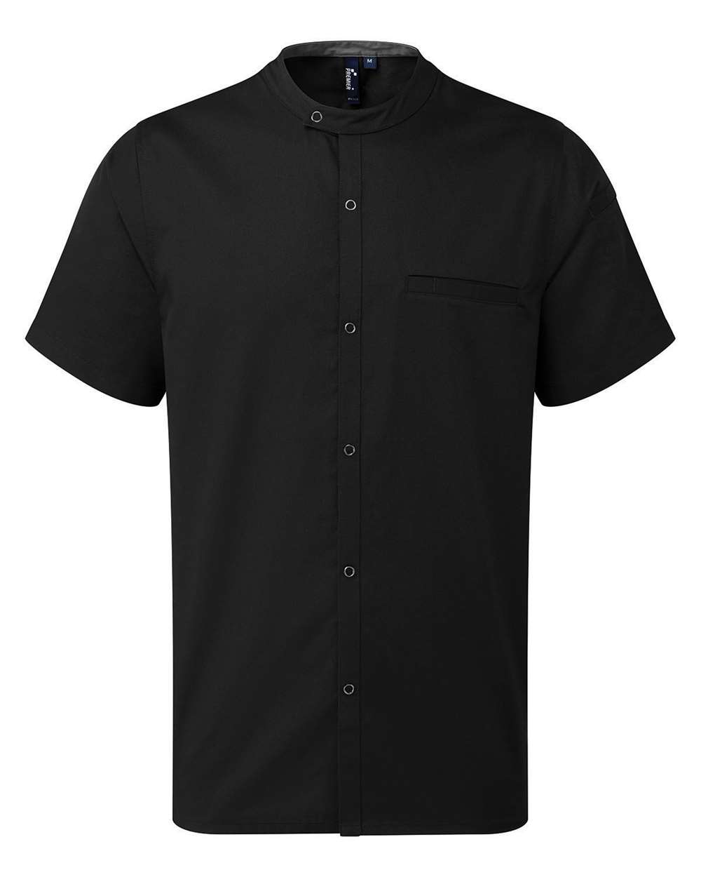 5 oz./yd_, 65/35 recycled polyester/cotton twill Mandarin collar with stud fastening  Contrast color inner neckband Left chest pocket and upper...