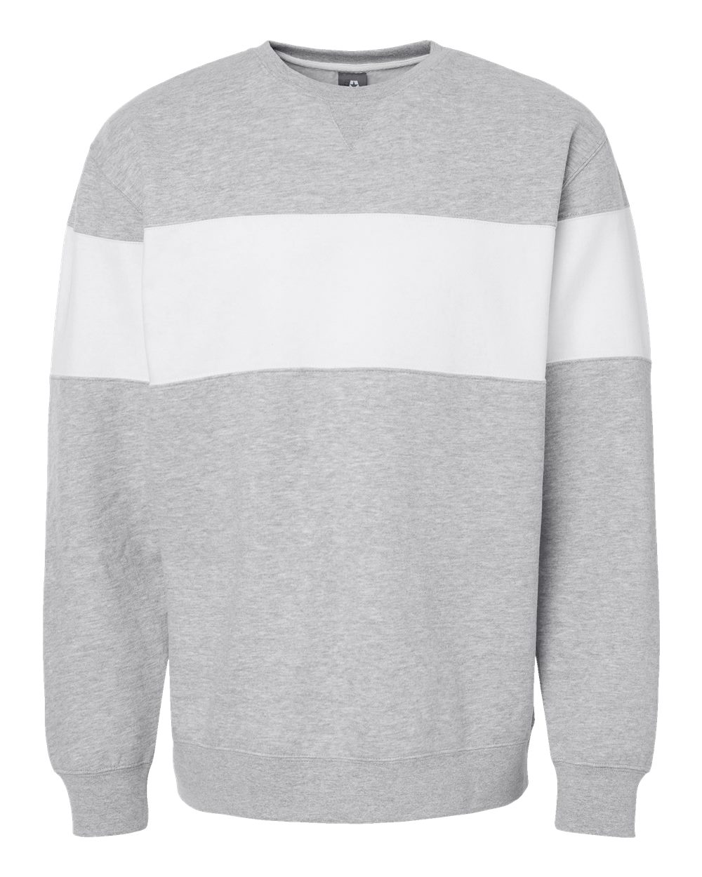 8 oz./yd_, 60/40 cotton/polyester sueded fleece Coverstitched throughout V-notch ribbed crewneck Ribbed cuffs and bottom hem Tear away label