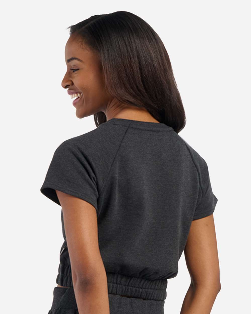 8.3 oz./yd_, 70/30 cotton/polyester French Terry Relaxed fit Raglan cap sleeves Cropped, cinched waistline