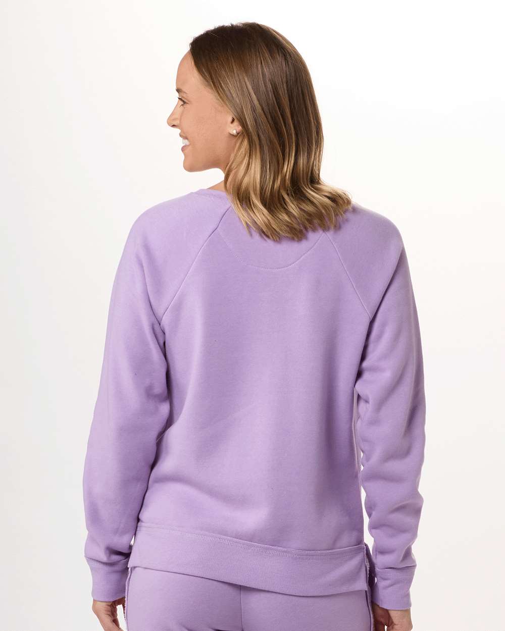 - Ribbed bottom band and sleeve cuff with raw edge seams