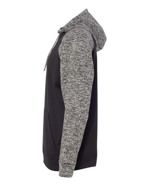 - Solid fleece body with charcoal fleck hood, drawcord and sleeves