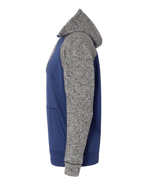 - Solid fleece body with charcoal fleck hood, drawcord and sleeves