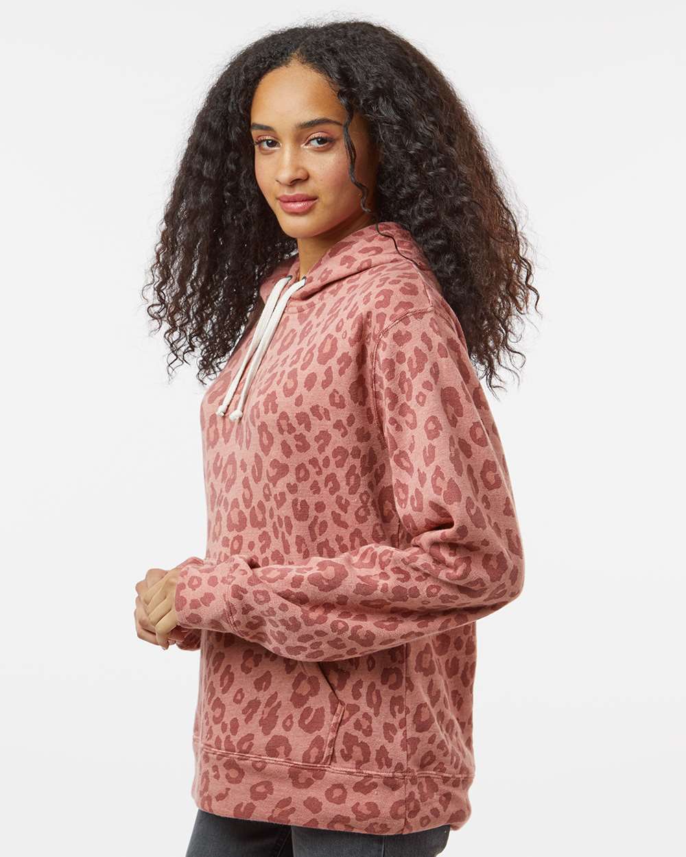 7.5 oz./yd_, 55/39/6 cotton/polyester/rayon triblend fleece Coverstitched throughout Off-white drawcord Pouch pocket Tear away label