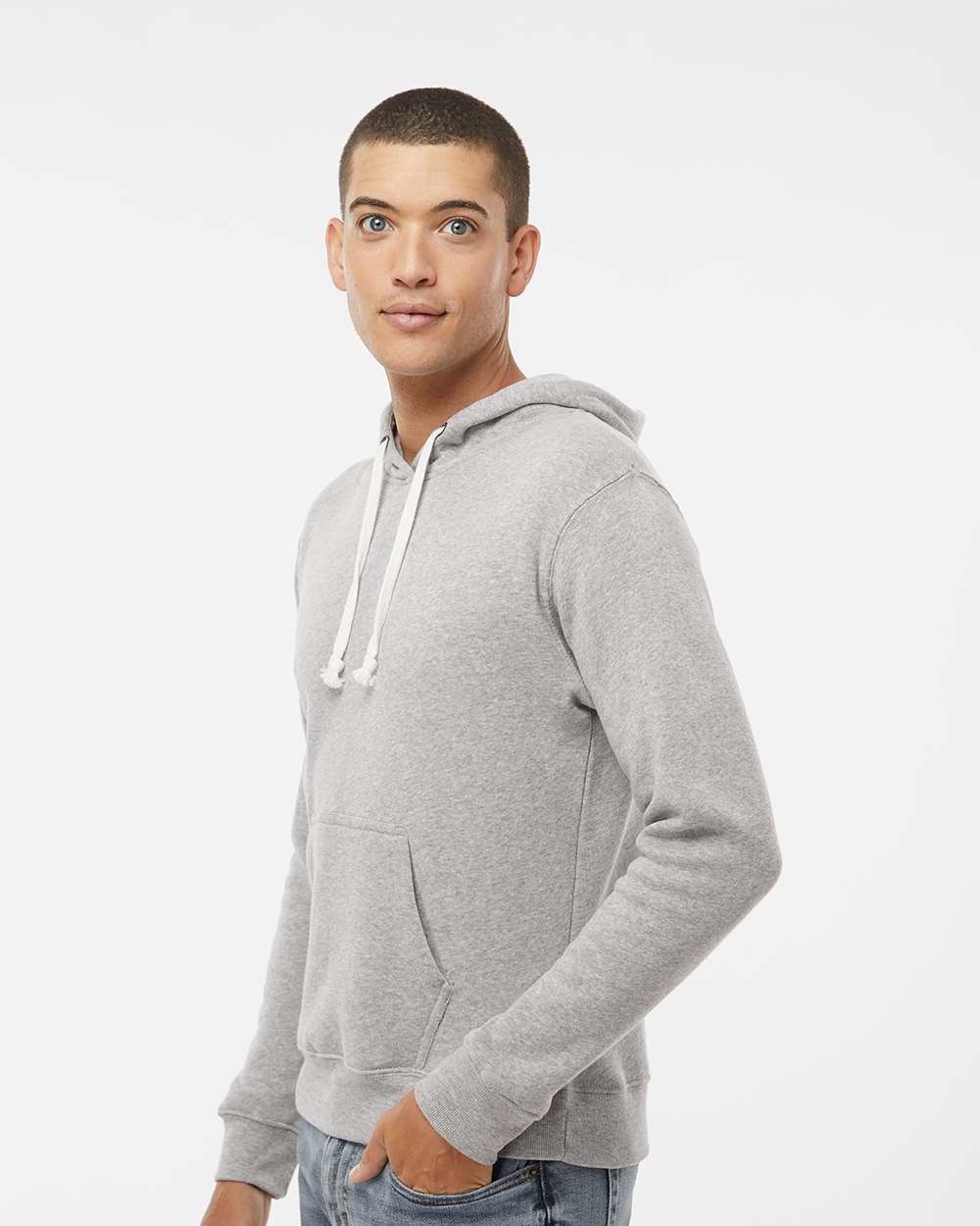 7.5 oz./yd_, 55/39/6 cotton/polyester/rayon triblend fleece Coverstitched throughout Off-white drawcord Pouch pocket Tear away label