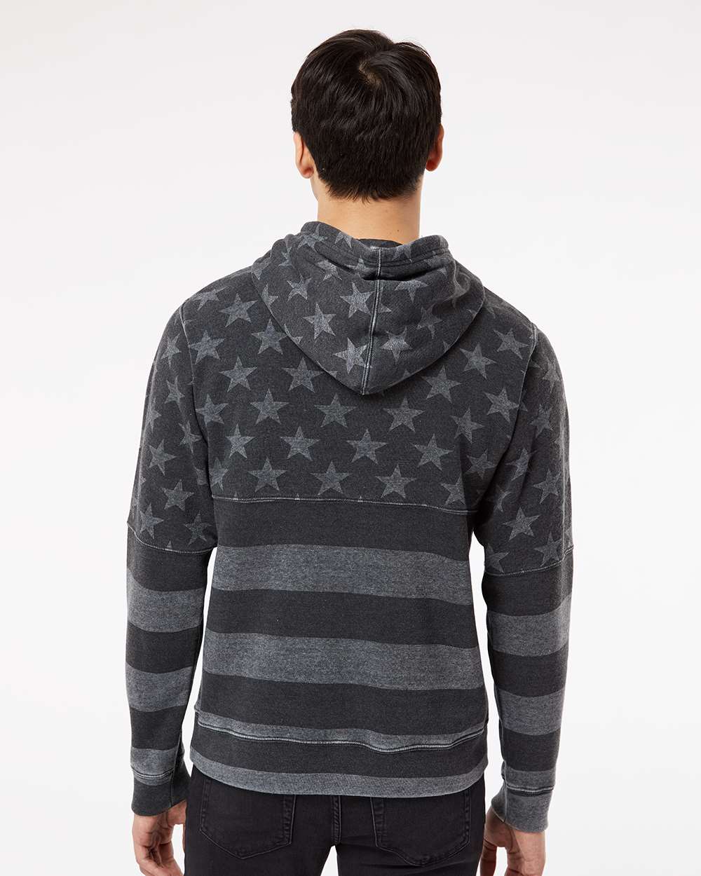 7.5 oz./yd_, 55/39/6 cotton/polyester/rayon triblend fleece Coverstitched throughout Off-white drawcord Pouch pocket Tear away label