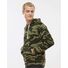 7.5 oz./yd_, 55/39/6 cotton/polyester/rayon triblend fleece Coverstitched throughout Off-white drawcord Pouch pocket Tear away label