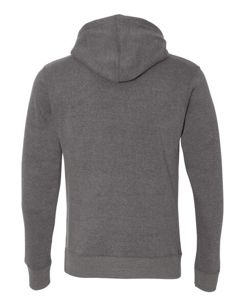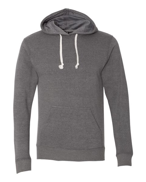 7.5 oz./yd_, 55/39/6 cotton/polyester/rayon triblend fleece Coverstitched throughout Off-white drawcord Pouch pocket Tear away label