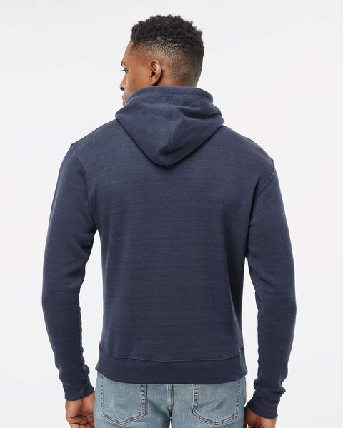 7.5 oz./yd_, 55/39/6 cotton/polyester/rayon triblend fleece Coverstitched throughout Off-white drawcord Pouch pocket Tear away label