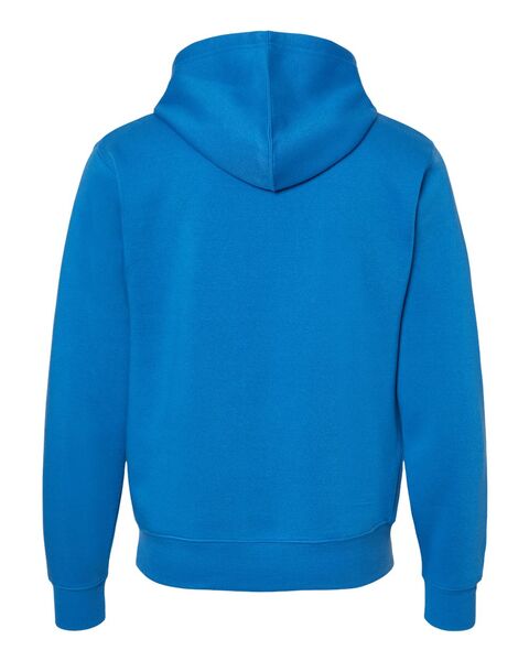 7.5 oz./yd_, 55/39/6 cotton/polyester/rayon triblend fleece Coverstitched throughout Off-white drawcord Pouch pocket Tear away label