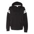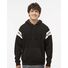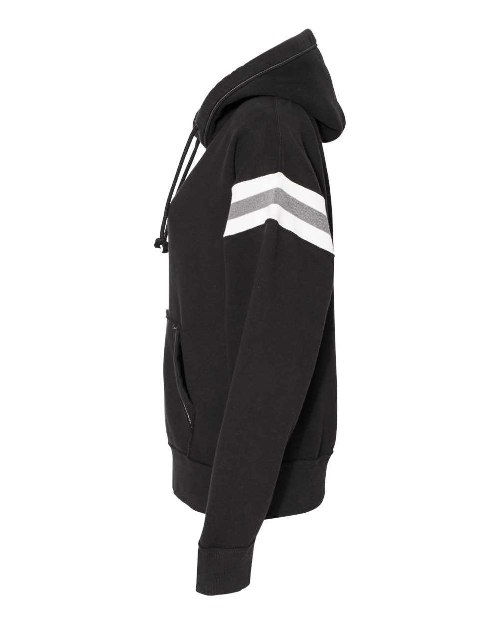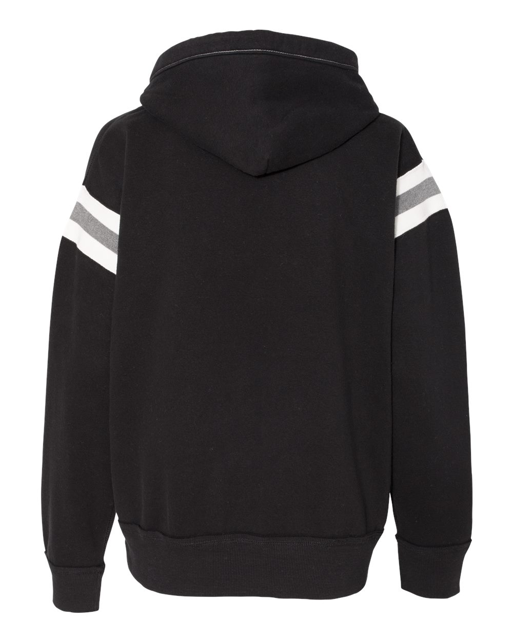9.3 oz./yd_, 60/40 cotton/polyester enzyme-washed fleece Yarn-dyed striped trim on shoulders Set-in sleeves Pouch pocket