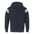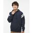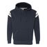 9.3 oz./yd_, 60/40 cotton/polyester enzyme-washed fleece Yarn-dyed striped trim on shoulders Set-in sleeves Pouch pocket