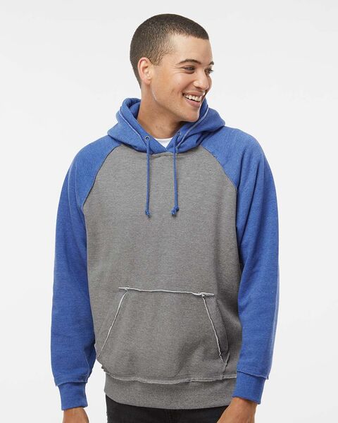9.5 oz./yd_, enzyme-washed 80/20 cotton/polyester heathered fleece Flatlock-stitched throughout Contrast-color hood, drawcord and sleeves Raglan sleeves...