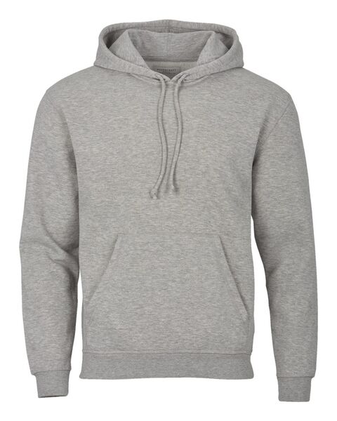 7 oz./yd_, 50/50 cotton/polyester 2-ply hood with self lining Folded rib cuffs and bottom opening Front pocket Woven loop label
