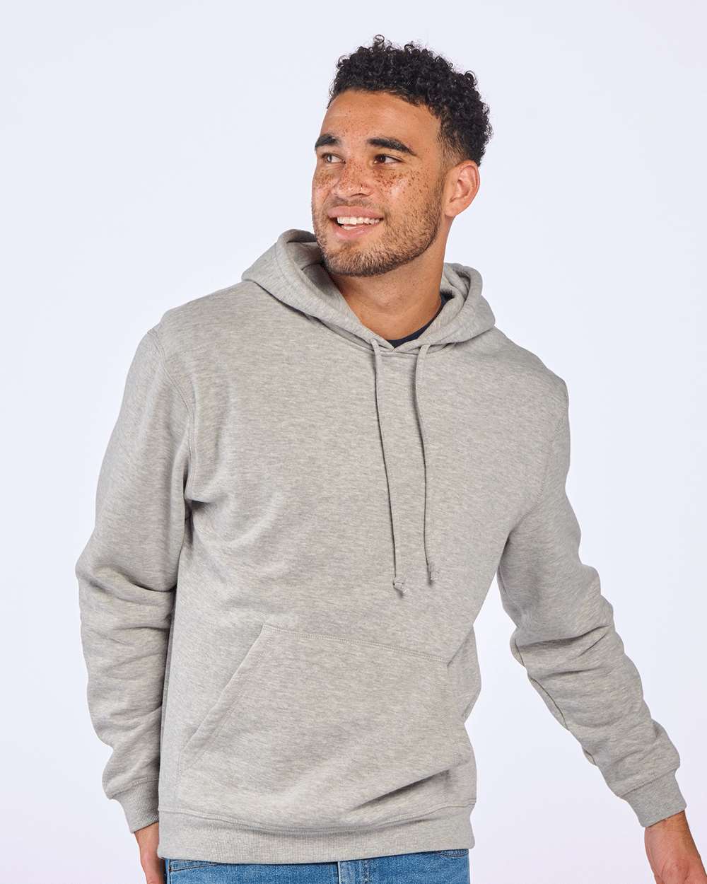 7 oz./yd_, 50/50 cotton/polyester 2-ply hood with self lining Folded rib cuffs and bottom opening Front pocket Woven loop label
