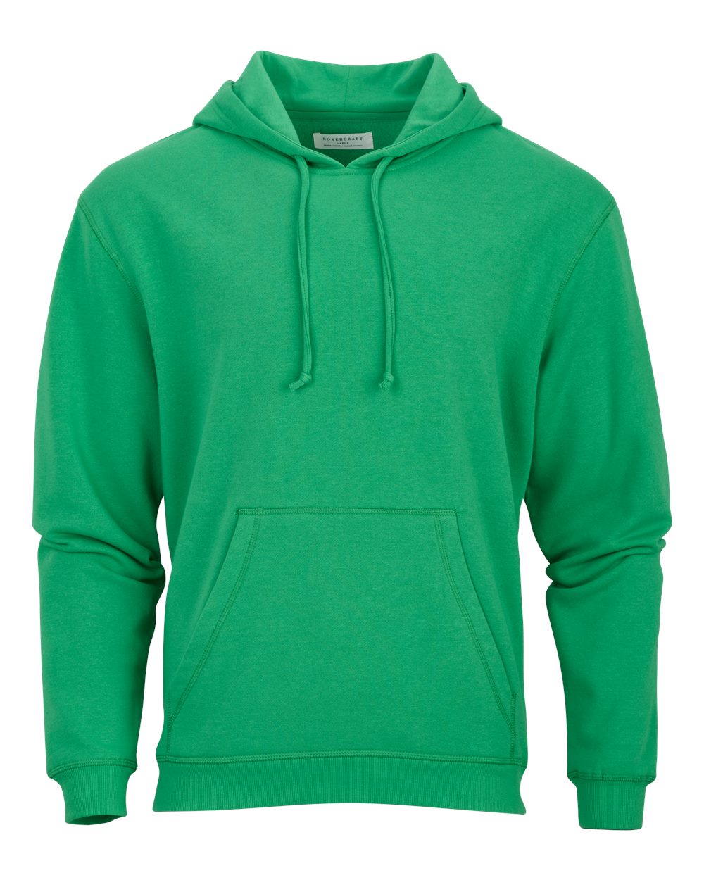 7 oz./yd_, 50/50 cotton/polyester 2-ply hood with self lining Folded rib cuffs and bottom opening Front pocket Woven loop label