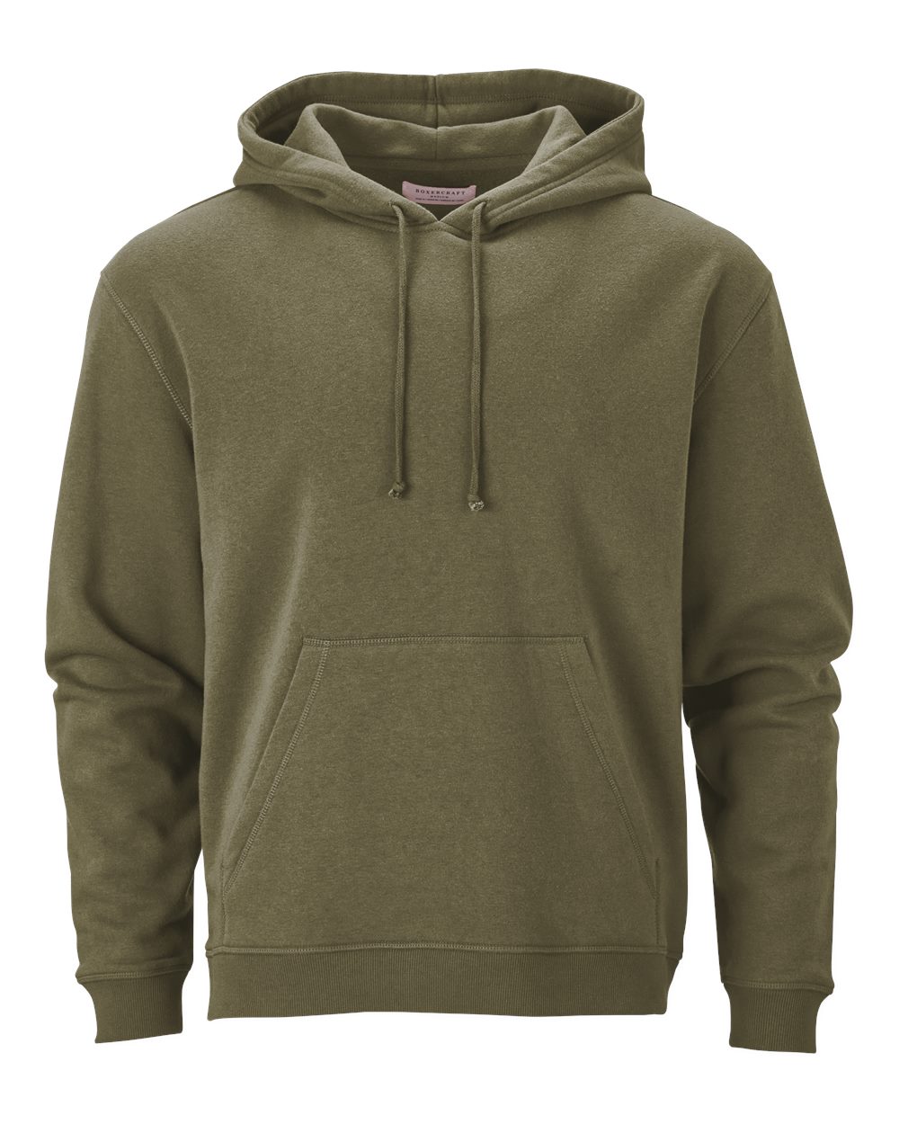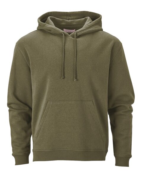 7 oz./yd_, 50/50 cotton/polyester 2-ply hood with self lining Folded rib cuffs and bottom opening Front pocket Woven loop label