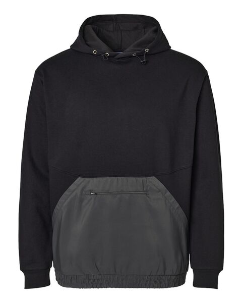 - 100% polyester woven tech pocket at center front with mesh lining and exposed zipper