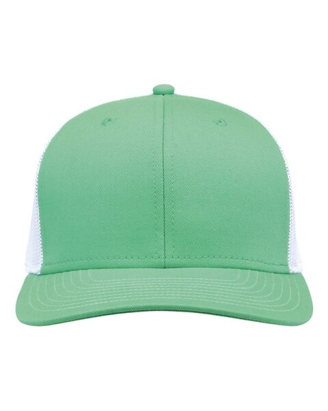 65/35 cotton/polyester Heather colors: 77/21/2 polyester/rayon/spandex Mesh back Structured, six-panel, mid-profile Pre-curved contrast stitched visor...