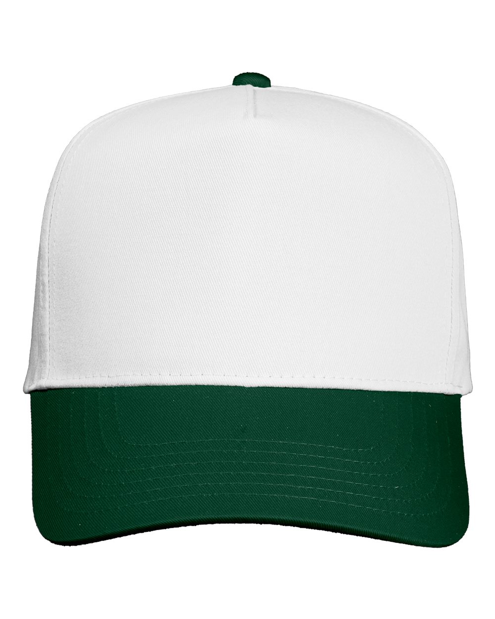 65/35 polyester/cotton twill Structured, five-panel, mid-profile Pre-curved visor Sewn eyelets Snapback closure Tear away label