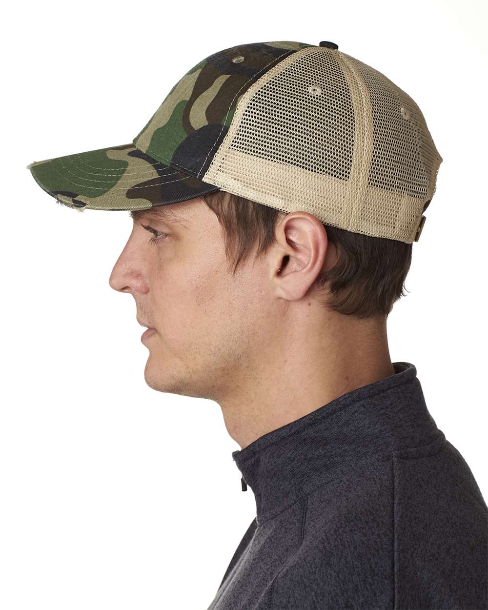 - Distressed torn visor and cotton twill sweatband