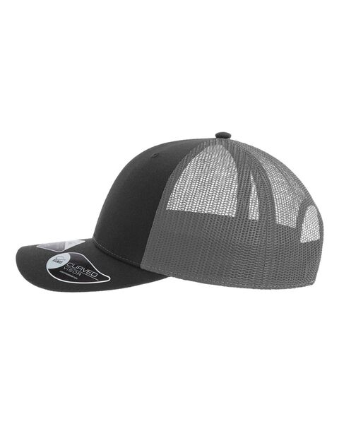 100% recycled polyester twill front 100% recycled polyester mesh back Structured, recycled buckram, five-panel, mid-profile Pre-curved visor, ReTraze...