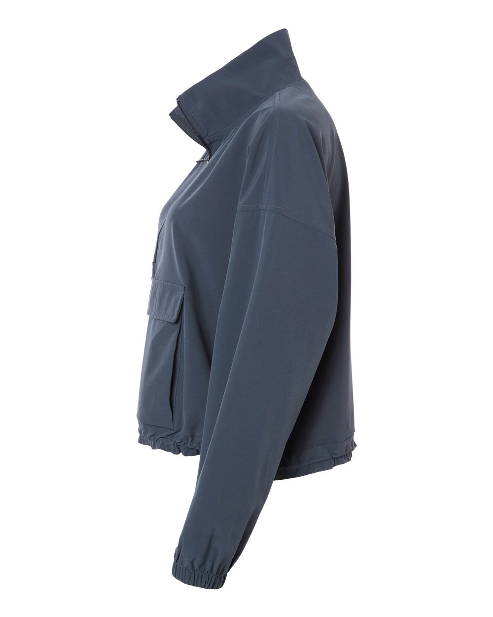 3.4 oz./yd_, 90/10 polyester/spandex, stretch woven Center front exposed zip placket Stand up collar Front pouch pocket with Velcro closure Drawcord...