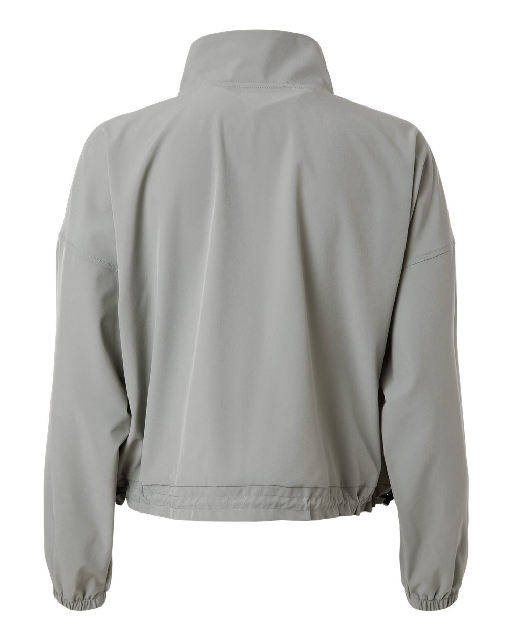 3.4 oz./yd_, 90/10 polyester/spandex, stretch woven Center front exposed zip placket Stand up collar Front pouch pocket with Velcro closure Drawcord...