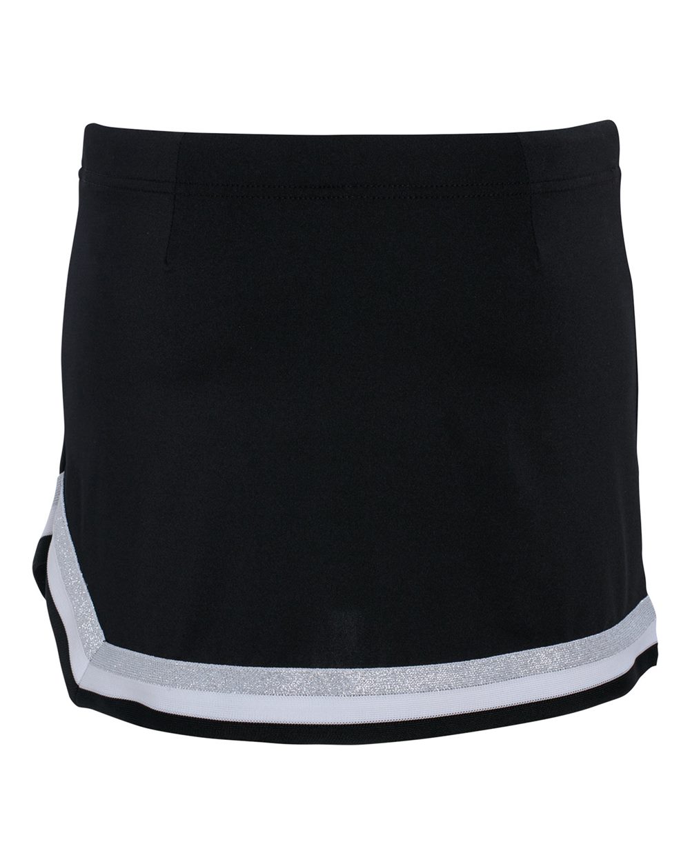 - Left side seam V-notch at hem accented with three-color trim