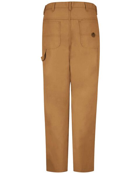 10 oz./yd_, duck 65/35 polyester/cotton Two deep scoop-front pockets Rule pocket on right leg Hammer hoop on left leg