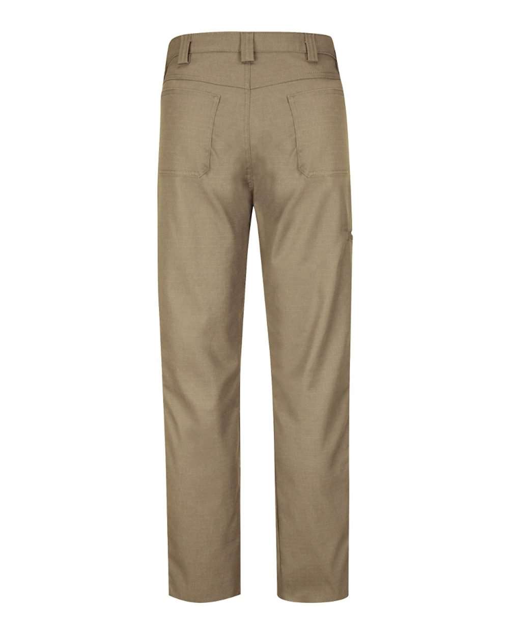6.5 oz./yd_, twill ripstop 70/28/2 polyester/cotton/spandex Concealed, no scratch button closure at waistband Two jean-style front pockets Two...