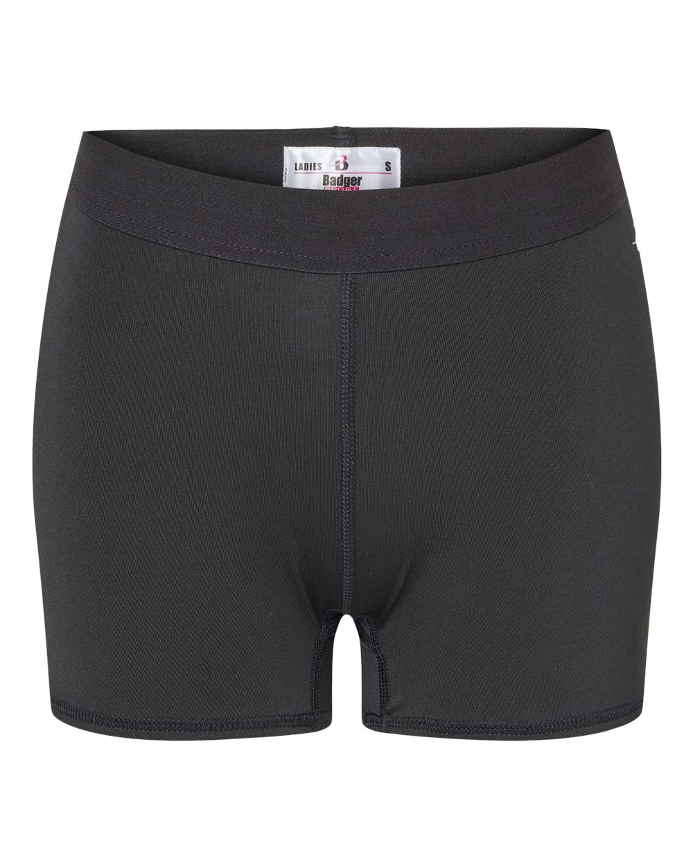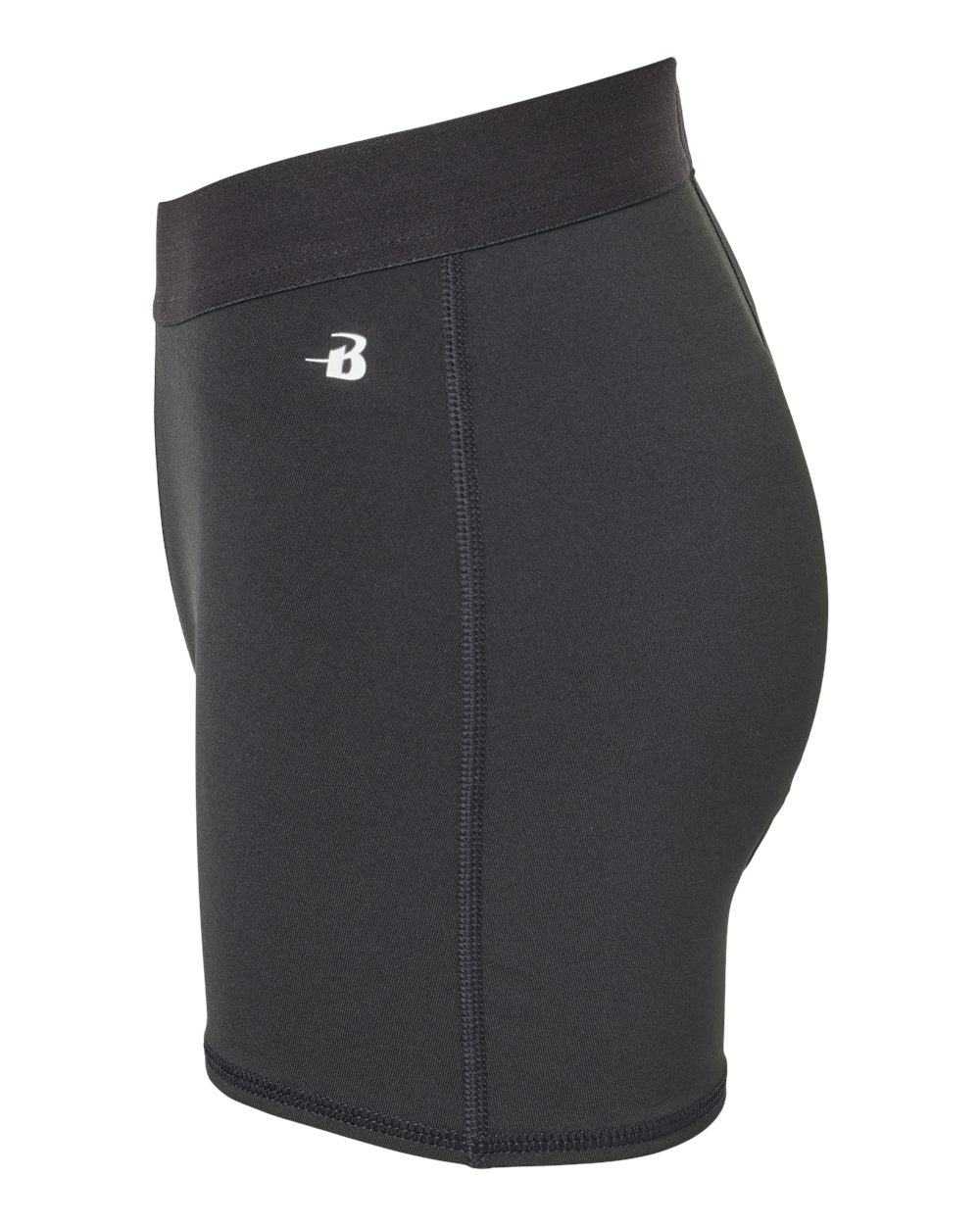 90/10 polyester/spandex moisture-management fabric Stretch body fit 1 1/2" black elastic waistband 3" inseam Badger heat seal logo on left...