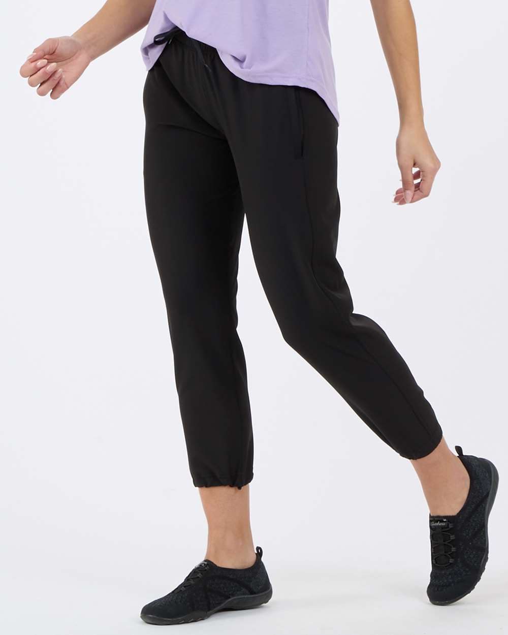 6.5 oz./yd_, 90/10 polyester/spandex Straight fit Wide waistband with drawcord Side entry pockets Inner elastic pull at leg opening Ankle length Heat...