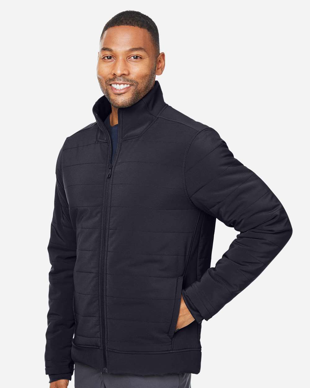 - Reverse coil center front zipper with dyed-to-match rubberized branded zipper pull