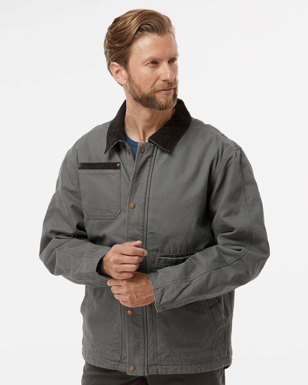 - Corduroy collar, placket and chest pocket trim