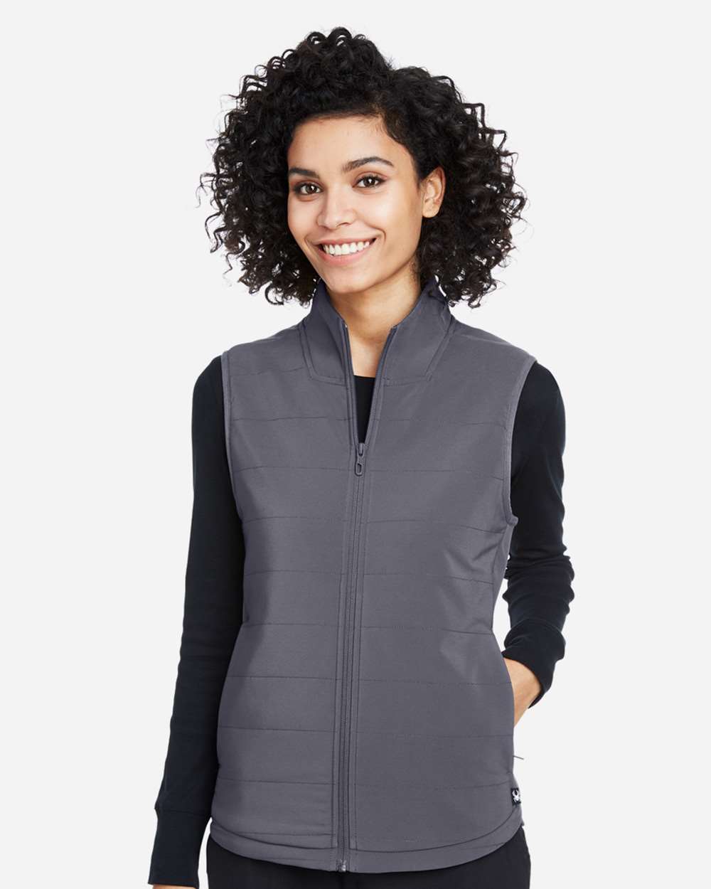 - Reverse coil center front zipper with dyed-to-match rubberized branded zipper pull