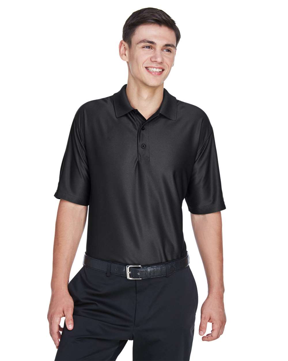 4.8 oz./yd_, 100% micro-textured polyester knit Anti-bacterial Moisture-wicking Flat-knit collar Three-button placket