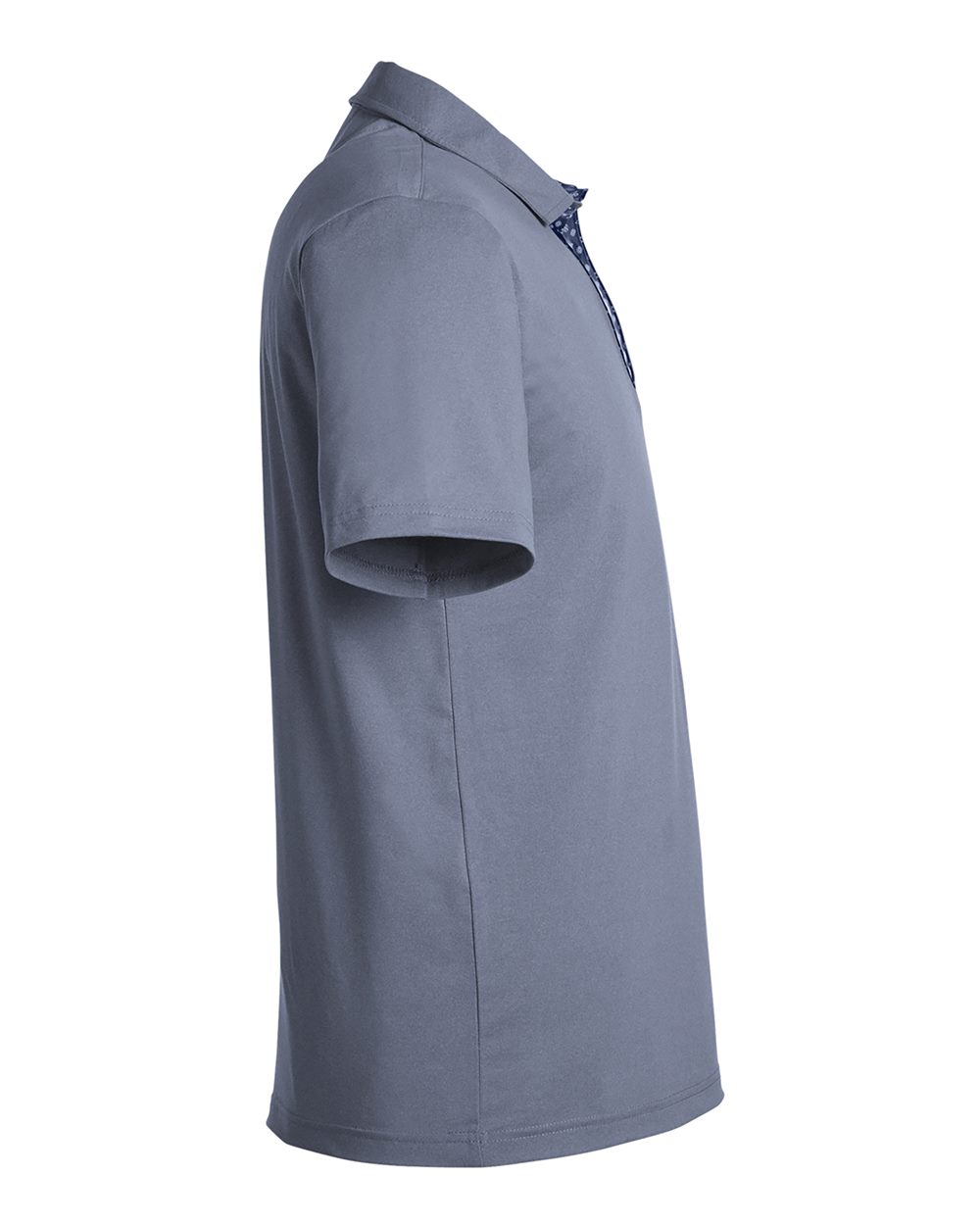 5.1 oz. 90/10 polyester/spandex, heathered Lightweight Three-button placket with collar stand Geo print accent on inside of placket and collar stand...