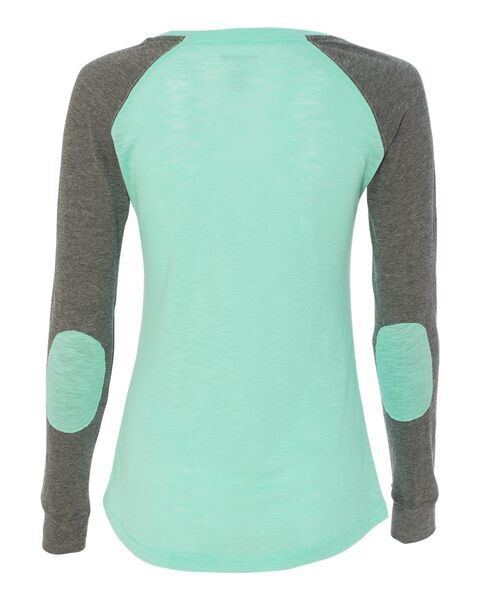 4.3 oz./yd_, 60/40 cotton/ polyester slub jersey Slub finish adds a subtle texture Feminine fit with a flattering neckline Contrast-color elbow patches...