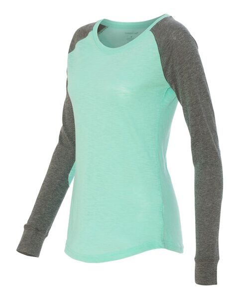 4.3 oz./yd_, 60/40 cotton/ polyester slub jersey Slub finish adds a subtle texture Feminine fit with a flattering neckline Contrast-color elbow patches...