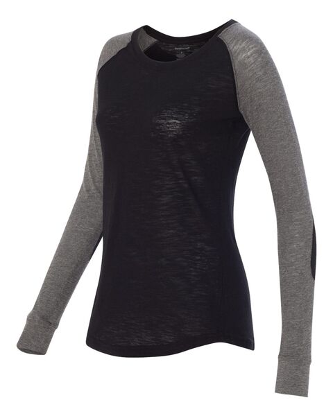 4.3 oz./yd_, 60/40 cotton/ polyester slub jersey Slub finish adds a subtle texture Feminine fit with a flattering neckline Contrast-color elbow patches...