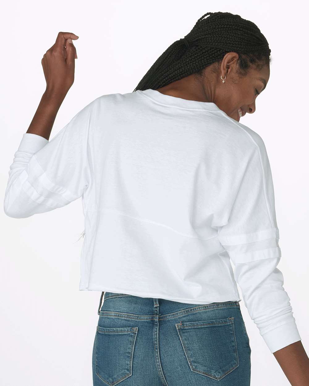 5.5 oz./yd_, 100% cotton ring-spun jersey Oxford Heather: 90/10 cotton/polyester Relaxed, oversize fit Crop top shape Double athletic sleeve stripes...