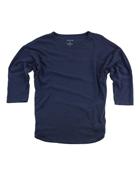 5.3 oz./yd_, 100% cotton jersey Oversized ladies fit tee 3/4-length sleeves Dyed to match sleeve stripes Front and back yoke seam Pigment-dyed for...