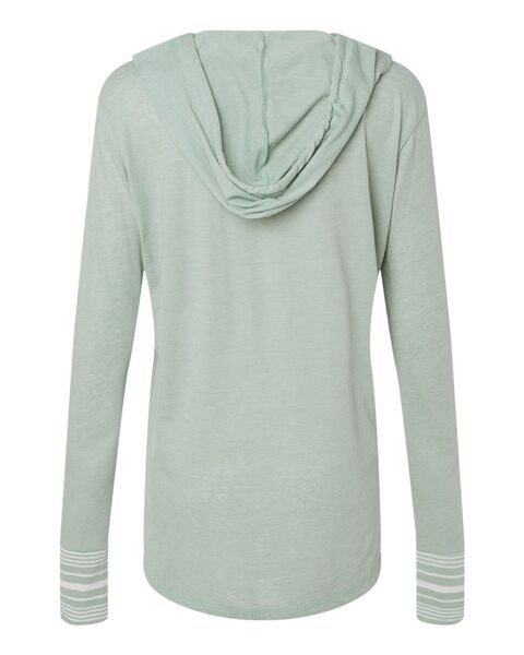 3.8 oz./yd_, 55/45 cotton/polyester heathered jersey Yarn-dyed striped back neck tape, drawcord and cuffs High-low hem with side vents