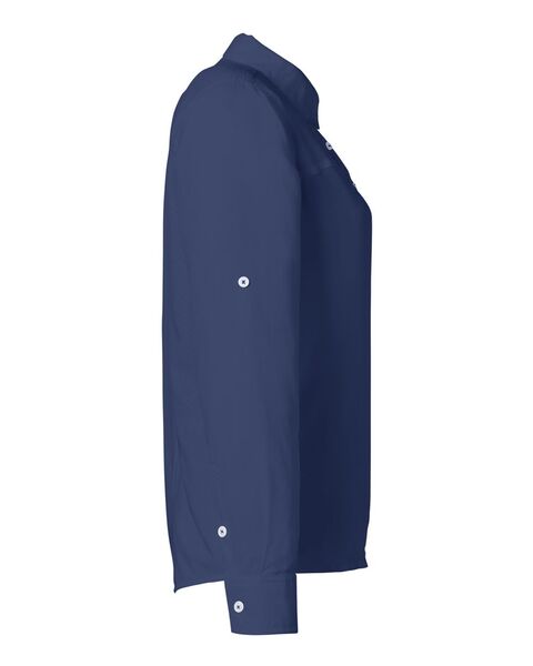 100% polyester UPF 30+ protection Mechanical stretch Button roll-up sleeves Laser perforated back for comfort