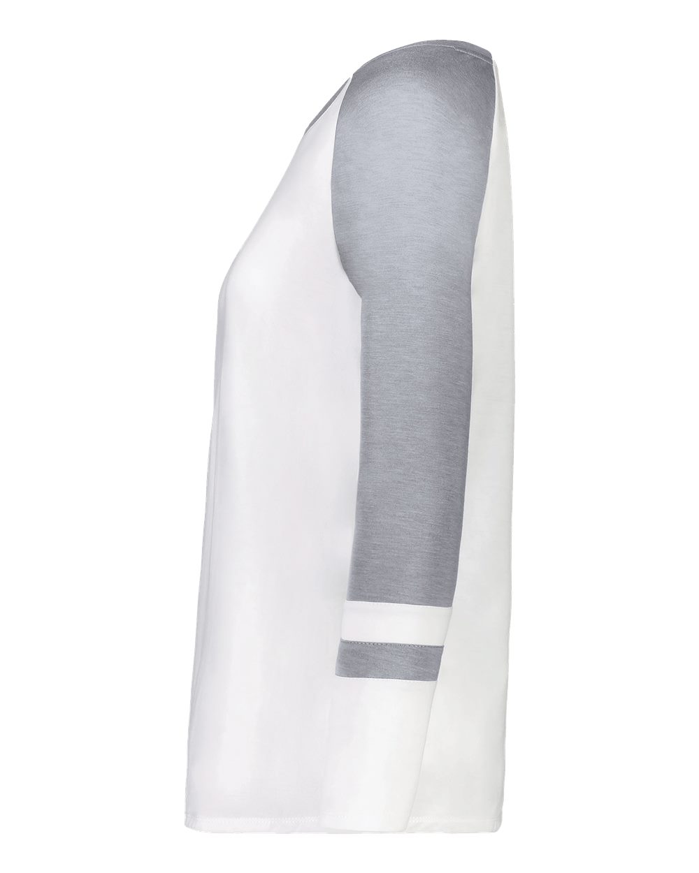 3.8 oz./yd_, 50/38/12 polyester/cotton/rayon triblend knit White/ Grey Heather is 4.7 oz./yd_ Scoop neck Raglan sleeves Tagless label