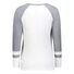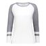 3.8 oz./yd_, 50/38/12 polyester/cotton/rayon triblend knit White/ Grey Heather is 4.7 oz./yd_ Scoop neck Raglan sleeves Tagless label