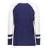 3.8 oz./yd_, 50/38/12 polyester/cotton/rayon triblend knit White/ Grey Heather is 4.7 oz./yd_ Scoop neck Raglan sleeves Tagless label