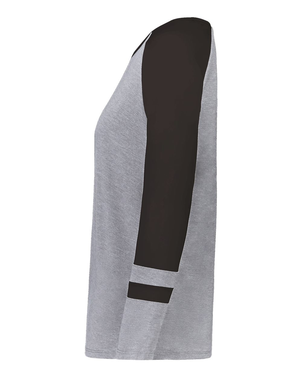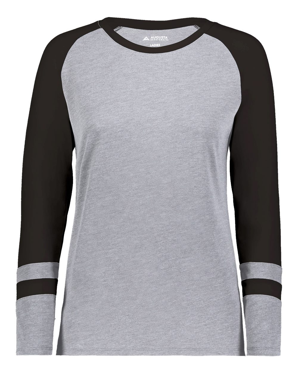 3.8 oz./yd_, 50/38/12 polyester/cotton/rayon triblend knit White/ Grey Heather is 4.7 oz./yd_ Scoop neck Raglan sleeves Tagless label