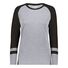 3.8 oz./yd_, 50/38/12 polyester/cotton/rayon triblend knit White/ Grey Heather is 4.7 oz./yd_ Scoop neck Raglan sleeves Tagless label